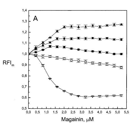 除上述相似性外,當使用芘標記的脂質類似物研究酸性磷脂對脂質動力學的影響時,兩種肽之間也存在明顯差異。Magainin 2導致兩性磷脂組成的LUV的芘發射顯著猝滅(圖2A)。然而,在PG存在的情況下,芘的單體強度增加,XPG逐漸增加了這種效應的幅度(圖2A)。圓二色性、拉曼光譜、傅里葉變換紅外光譜和固態核磁共振研究表明,馬蓋寧在與脂質雙層結合時采用螺旋構象(Matsuzaki等人,1989年、1991年;Williams等人,1990年;Jackson等人,1992年;Bechinger等人,1993年;Wieprecht等人,1997年;Hirsh等人,1996年)。magainin 2對兩種膜的這些不同影響可能是由于1)通過與肽的帶正電基團(例如賴氨酸的?氨基)直接接觸使芘熒光猝滅,或2)插入雙層的=-螺旋肽改變熒光團的微環境,與層平面平行,如上所述。然而,在PG存在的情況下,肽的正電荷應在與酸性磷脂形成靜電復合物時被中和,從而減少由于π-陽離子相互作用導致的芘熒光猝滅。