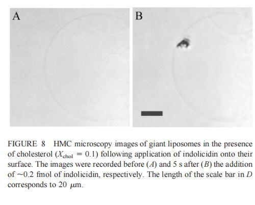 隨后,我們研究了吲哚西丁對由SOPC和膽固醇組成的巨大脂質體(Xchol?0.1)的影響。吲哚西丁在膽固醇存在的情況下也會引起巨大脂質體的起泡。形成的內吞小泡在巨大小泡的表面上深度聚集(圖8b)。具體地說,在添加約0.2 fmol吲哚西啶(~400 fl,20次注射,圖8 B)后約5 s內,巨大脂質體表面出現一簇小顆粒。隨后,聚集物轉移到巨大的脂質體中,同時也有少量內吞顆粒(θ≈0.9米)處可見。進一步添加吲哚西丁會增加這些顆粒的數量,并導致巨大脂質體收縮。然而,即使在暴露于~2 fmol吲哚西丁(200次注射,數據未顯示)的情況下,膜大體上仍保持完整。