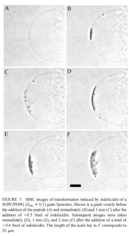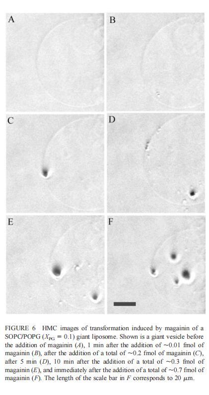 由于上述magainin 2和吲哚西啶對單層和LUV具有明顯的脂質成分依賴性作用,因此有興趣使用巨型脂質體比較這些肽對宏觀膜的三維拓撲結構的影響,無論是否含有PG,都可以在交流電場中形成由SOPC組成的巨大脂質體。即使暴露于大量肽(~2 fmol,~4 pl=200次重復注射,數據未顯示),SOPC膜也不受magainin 2的影響。同樣,由SOPC和膽固醇(Xchol=0.1)組成的巨大脂質體也不受此量的馬蓋寧2的影響(數據未顯示)。然而,在存在POPG(XPG=0.1)的情況下,已經~0.01 fmol(單次~20 fl注射)的magainin 2應用于巨大囊泡表面,顯著影響巨大脂質體膜的拓撲結構(圖6 B)。更具體地說,在~1分鐘內,小顆粒(θ≈0.9米)出現在巨大的囊泡內。隨后注射高達~0.1 fmol(約200 fl)的magainin 2不會引起進一步的可見變化。在總共添加約0.2 fmol的肽后,膜開始起伏,形成致密顆粒(θ≈4 m)在巨大脂質體內可見(圖6 C)。在~5分鐘內,幾個小顆粒(θ≈0.9 m)出現在巨大脂質體膜的內表面(圖6 D)。隨后,大多數小顆粒進入巨大囊泡的內腔。這些內吞小泡似乎在巨大脂質體內自由移動,在隨后30分鐘的觀察中沒有進一步的變化。進一步注射magainin 2,提供總共0.3 fmol的肽,引起類似內吞作用的過程,出現直徑約8 m的致密顆粒(圖6 E)。約10分鐘后,巨大脂質體內約0.9-m顆粒的數量繼續增加。偶爾,這些顆粒也出現在巨大囊泡的外表面,并釋放到外部緩沖液中(圖6 E)。隨后添加magainin 2(~0.7 fmol)使膜不穩定并誘導進一步的囊泡形成(圖6 F)。這些內吞囊泡在巨大脂質體內彼此分離,巨大囊泡的大小明顯減小(圖6f)。最終,在進一步添加magainin 2(高達~1.5 fmol)后,巨大的脂質體膜崩塌。上述形態學變化具有高度的可重復性。