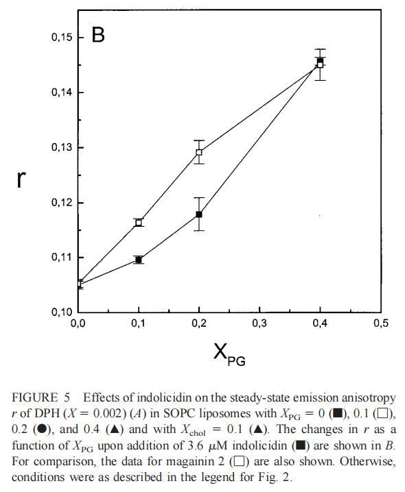 雖然熒光光譜顯示,馬蓋寧2和吲哚西啶對脂質動力學的影響存在明顯差異,但也存在一些明顯的相似之處。因此,DPH各向異性r的增加表明,在存在酸性磷脂的情況下,這兩種肽都會導致酰基鏈順序的增加,這種影響的程度隨著XPG的增加而增加(圖3b和5b)。同樣,在膽固醇存在的情況下,兩種肽對芘熒光的有效猝滅也很明顯(圖2a和4a)。這可能與膽固醇的OH基團和馬蓋寧的E19殘基之間的相互作用有關(Tytler等人,1995年),該肽在膜中具有跨膜取向。當Xchol=0.1時,r值的增加是由于吲哚西丁所致,而馬加寧則無影響。這表明,在膽固醇存在的情況下,吲哚肽可能采用跨雙層取向,其長軸垂直于雙層平面。