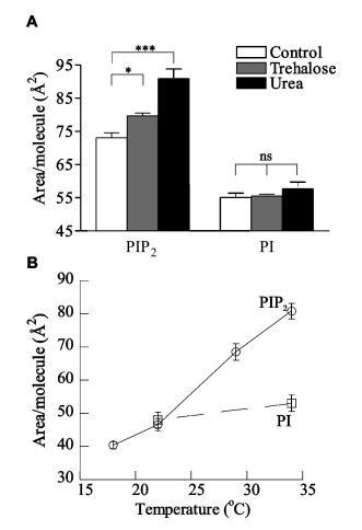 圖4:。水介導分子間氫鍵的證據。HEPES緩沖亞相上的L-R PIP2和L-R PI在π)30 mN/m時的每分子面積,pH 7.4(A)存在5 mM海藻糖和5 m尿素,(B)作為亞相(O)PIP2溫度的函數;0)PI)。