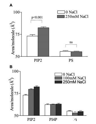 圖2:。鹽膨脹效應對PIP2的特異性。(A)L-R PIP2和L-R PS的每分子面積;和(B)HEPES緩沖亞相上的L-R PIP2、L-R PI(4)P和L-R PI,pH 7.4,π)30mN/m下的30°C。平均值(SE,n)4。
