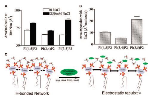 圖5:。亞相氯化鈉膨脹效應的PIP2異構體特異性。(A)HEPES緩沖亞相上的DO-PIP2異構體在π)30 mN/m時的每分子面積。平均值(SE,n)7。(B)250 mM NaCl和無亞相NaCl之間DOPIP2異構體的每分子面積差異。通過雙向ANOVA測量,NaCl效應的異構體依賴性顯著達到p)0.0001。(C)PIP2分子間相互作用的概念動畫。在沒有潮向性試劑(綠色橢圓)的情況下,PIP2分子形成水介導的氫鍵網絡。當添加潮向性聚合物時,網絡被破壞,帶電磷酸鹽之間的靜電排斥導致單層的膨脹。