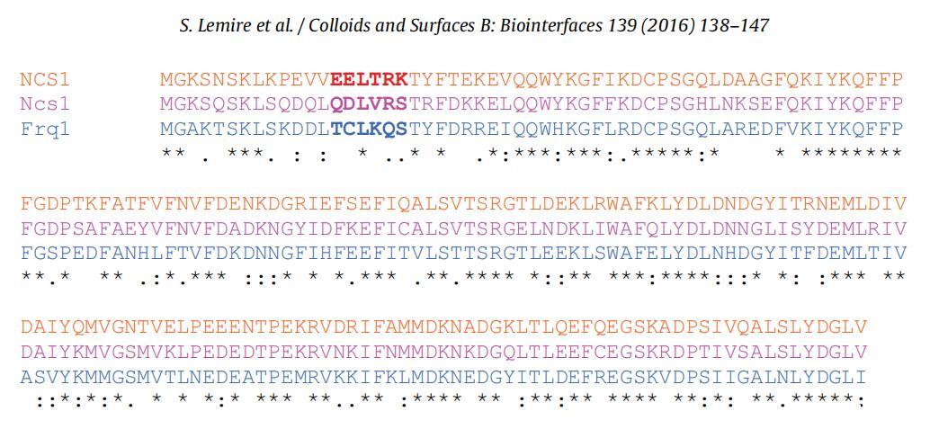 圖1.人類NCS1(橙色)、裂變酵母NCS1(粉紅色)和芽殖酵母Frq1(藍色)的序列比對。在鈣存在和不存在的情況下,負責肉豆蔻基擠出的基序用紅色表示[29](為了解釋本圖例中對顏色的引用,讀者請參閱本文的網絡版本)。