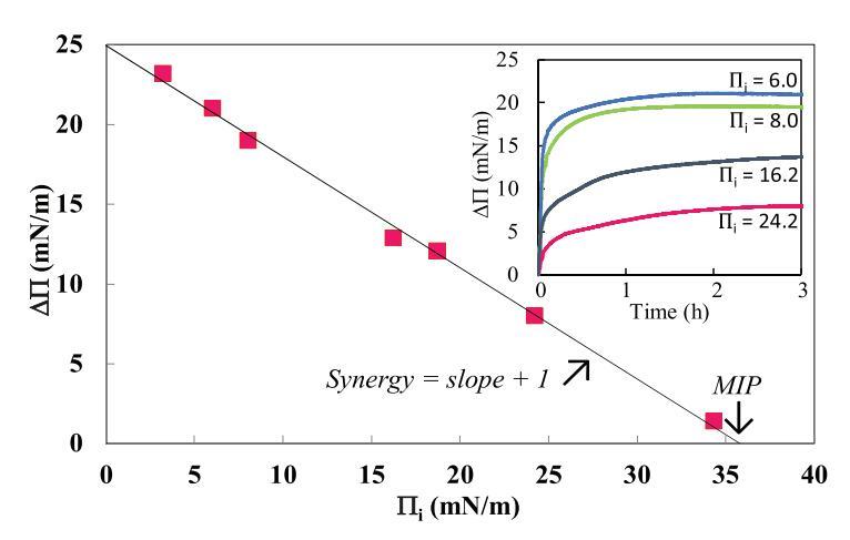 確定綁定參數的典型示例如圖2所示。實際上,對于6.0、8.0、16.2和24.2 mN/m的i,分別獲得了21.0、19.0、12.9和8.0 mN/m的(圖2插圖)。被繪制為i的函數,導致負斜率。因此,在DPPE存在的情況下,mNCS1的MIP值為35.8±1.1 mN/m,協同值為0.30±0.02。這種積極的協同作用表明mNCS1和這種脂質單層之間發生了積極的相互作用。然后,以不同的i注射每種脂質和MIP,并根據表面壓力動力學計算協同值。
