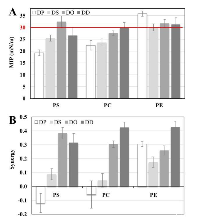 圖3.在鈣存在下,使用DPP、DSP、DOPS、DDPS、DPPC、DSPC、DOPC、DDC、DDPC、DPPE、DSPE、DOPE、DOPE和DDPE單層的mNCS1的MIP(A)和協同(B)值。MIP和synergy值的不確定性如第2.3節所述計算。