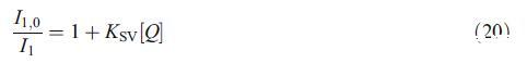 純表面活性劑的Nagg與報告值一致[17]。圖5顯示了混合聚合數與理想值的正偏差。在圖5中,我們觀察到加入離子表面活性劑后,混合膠束的聚集數顯著減少,αHTPB=0.55,之后保持恒定并接近離子膠束的聚合數。這種行為可以通過考慮膠束中表面活性劑的離子頭基團之間的靜電相互作用來解釋。隨著離子物種的加入增加,靜電排斥也增加,導致靜電自由能增加。這種效應應導致表面活性劑的每頭基團的面積增加,其結果是聚集數減少。根據熒光猝滅數據,還可以根據以下關系式[24]評估斯特恩-沃默(KSV)常數,該常數反映熒光團對猝滅劑的可接近性: