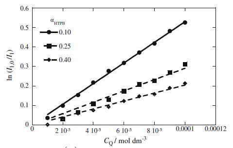 KSV值根據公式20(數據未顯示)的斜率進行評估,如圖6所示。圖6顯示KSV的值隨著HTPB成分含量的增加而降低,反映出熒光團變得更難接近猝滅劑。據報道,隨著陽離子gemini表面活性劑摩爾組成的增加,KSV降低[24]。