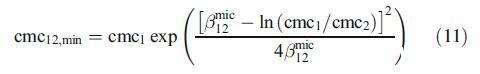 另一方面,在混合膠束形成過程中,含有兩種表面活性劑的混合物中協同作用的存在不僅取決于它們之間相互作用的強度,還取決于二元兩親混合物中單個表面活性劑組分的相關性質[23]。因此,混合膠束形成中協同作用所需的條件是bmic 12必須為負(見上節),且βmic 12>jlnecmc1=cmc2Tj(表2)。對于本二元混合物,這兩個條件都滿足。混合膠束形成中可能的協同程度通過混合表面活性劑的摩爾濃度與單個組分的摩爾濃度相比的最大降低來測量,即(cmc1)?cmc12,min)/(cmc1),其中cmc12,min是混合表面活性劑的最小cmc,由下式給出: