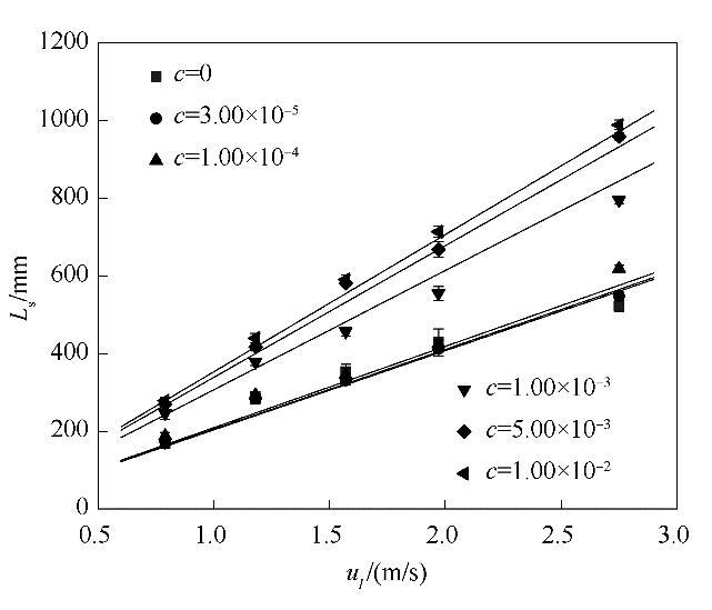 為了定量表征表面張力變化對(duì)射流破裂過程的影響,實(shí)驗(yàn)測量了含表面活性劑射流的射流破裂長度。射流破裂長度定義為噴嘴出口至射流首次發(fā)生破裂處的距離。圖6是含表面活性劑射流破裂長度隨射流速度u l的變化趨勢,其中L s(mm)表示含表面活性劑射流的射流破裂長度,L l(mm)為水的射流破裂長度。從圖6(a)中可以看出,當(dāng)表面活性劑濃度保持不變時(shí),提高液體射流速度會(huì)增大射流破裂長度。從圖6(b)中可以看出,當(dāng)液體射流速度保持不變時(shí),隨著表面活性劑濃度的增大,射流破裂長度總體上呈現(xiàn)逐漸增大的趨勢;射流速度越大,射流破裂長度增大的趨勢就越明顯。使用相同工況下水的射流破裂長度無量綱化含表面活性劑射流的破裂長度后,可以得到射流破裂長度比隨射流速度以及表面活性劑濃度的變化趨勢,如圖6(c)、(d)所示。從圖中可以看出,表面活性劑的加入顯著增大了射流破裂長度比。在表面活性劑濃度不變時(shí),提高液體射流速度對(duì)射流破裂長度比的影響并不顯著。在射流速度保持不變時(shí),提高表面活性劑濃度會(huì)導(dǎo)致射流破裂長度比的增大。