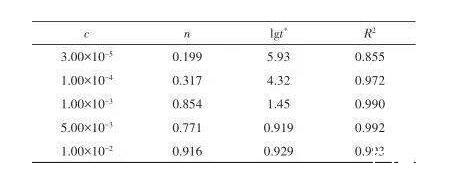 圖4展示了不同SDBS濃度下lg S隨lg t的變化規(guī)律,圖中實(shí)線對(duì)應(yīng)各濃度下動(dòng)態(tài)表面張力的擬合曲線,此時(shí)圖中時(shí)間t的單位為ms。從圖中可以看出,擬合結(jié)果與實(shí)驗(yàn)數(shù)據(jù)吻合較好,擬合曲線能夠較好地表征動(dòng)態(tài)表面張力的時(shí)間演變趨勢。擬合得到的系數(shù)見表1。