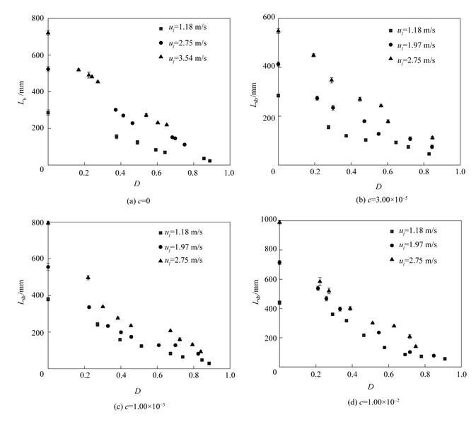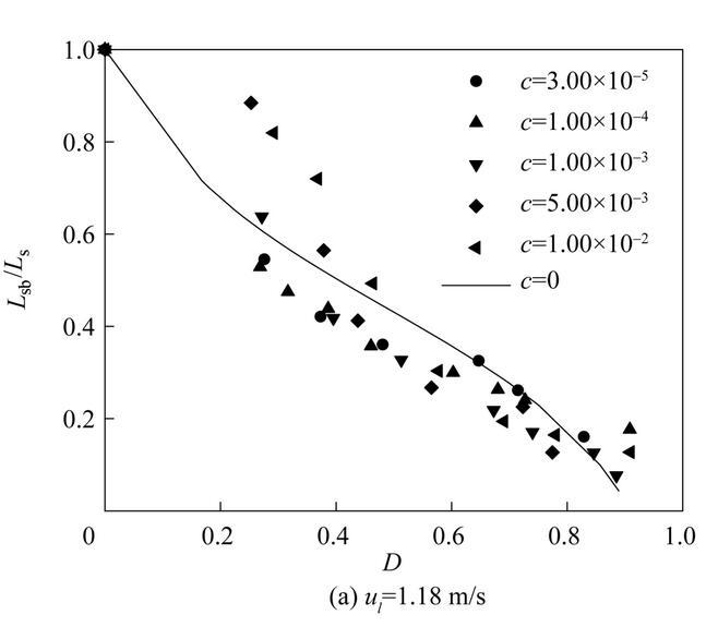 圖11是不同濃度表面活性劑射流破裂長度L sb隨氣泡無量綱直徑D=d b/d 0(d b為氣泡直徑)的變化。從圖中可以看出,不同表面活性劑濃度下,射流破裂長度隨氣泡無量綱直徑D的變化趨勢是相似的。射流破裂長度隨著氣泡直徑的增大逐漸減小;當(dāng)氣泡直徑相同時(shí),提高液體射流速度會(huì)導(dǎo)致更大的射流破裂長度。