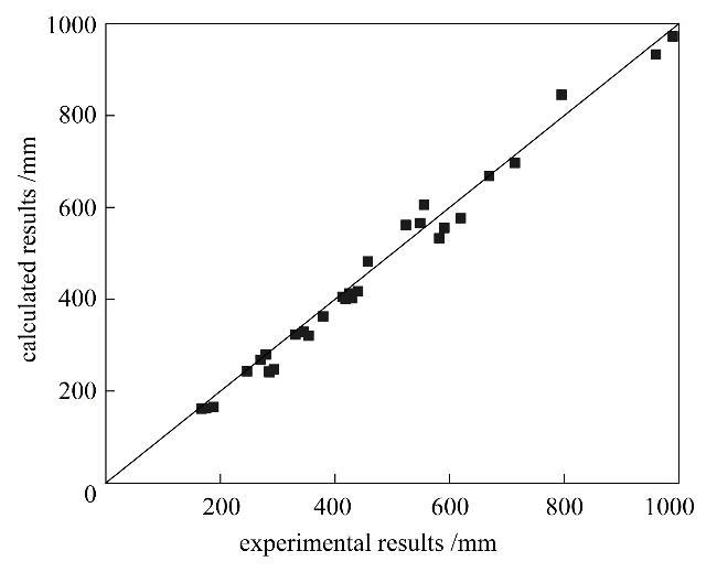 圖9射流破裂長度實(shí)驗(yàn)測量值與擬合計(jì)算值的比較Fig.9Comparison between experimental results and calculated results