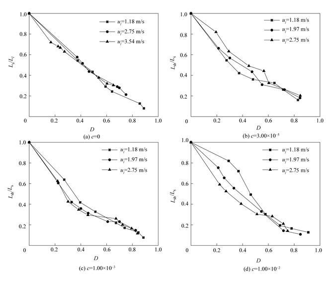 如圖12所示,當(dāng)氣泡直徑較大時(shí),破裂長度比基本不隨射流速度的改變而改變。這是由于此時(shí)氣泡引起的射流速度擾動(dòng)對(duì)射流破裂的影響占主導(dǎo)地位。在氣泡直徑較小時(shí),當(dāng)表面活性劑濃度c<1.00×10-2,不同射流速度下射流破裂長度比基本相同。當(dāng)表面活性劑濃度c=1.00×10-2,破裂長度比隨著射流速度的增大而逐漸減小。這可能與被削弱的Marangoni效應(yīng)有關(guān)。由式(10)可知,液體射流速度越大,液體對(duì)流造成的表面活性劑表面吸附量減少的趨勢越強(qiáng),波峰波谷間的表面張力差值越小,Marangoni效應(yīng)越弱,射流破裂長度增加的趨勢越弱。因此,在氣泡較小時(shí),隨著射流速度的增大,含氣泡射流的破裂長度比逐漸減小。在表面活性劑濃度較小時(shí),氣泡的存在進(jìn)一步減小了射流內(nèi)部表面活性劑的濃度,從而使得不同射流速度下Marangoni效應(yīng)的差別不明顯,不同射流速度下射流破裂長度比基本相同。