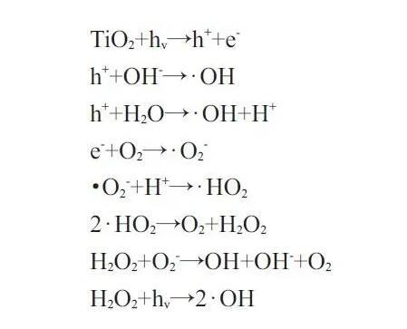 根據價帶理論,Ti O2為光催化劑,當吸收大于其帶隙的光能時,電子從價帶激發到導帶,產生電子(e-)-空穴(h+)對,這些放電載體可以快速遷移到催化劑顆粒的表面,在那里它們最終被捕獲并且與合適的底物發生氧化還原反應。反應式如下: