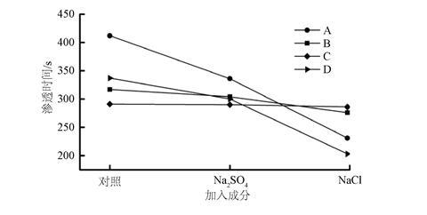 圖5.不同濃度NaCl對0.2 wt.%不同類型抑塵劑的滲透性影響