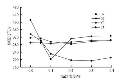 從圖4可知,NaCl對于提高抑塵劑潤濕性能的作用更為顯著。因此,在抑塵劑中加入不同濃度的NaCl,研究無機鹽濃度對煤塵NR的潤濕性能的影響。如圖5所示,少量的NaCl的引入,能夠降低抑塵劑在煤塵表面的滲透時間。NaCl的引入能夠降低抑塵劑溶液的表面張力,使抑塵劑在煤塵表面的接觸角不斷降低[18]。另外,無機鹽能夠增強表面活性物質在煤塵表面的吸附能力,降低煤塵與抑塵劑之間的界面能,提高了抑塵劑對煤塵的潤濕性能;煤塵中含有大量的酚羥基、羧基等有機基團,因此煤塵表面呈現電負性[19]。當NaCl含量持續增加時,抑塵劑A、B、C在煤塵表面的滲透時間趨于平穩,而抑塵劑D出現滲透時間增加后平緩的趨勢。相比之下,抑塵劑B、C對于NaCl的敏感程度較低,隨著NaCl含量增加其潤濕能力變化不大;NaCl對抑塵劑A、D在煤塵表面的潤濕能力影響程度較大。