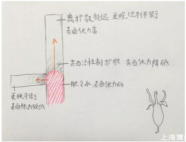低表面張力的液體滴到高表面張力的液體當中,由于表面張力不平衡,就會帶動液體向表面張力高的一邊流動,這種現象被稱為Marangoni效應。因為我滴了比較多的液體進去,藍色液體前進的動力肯定不只是表面張力,但這個因素對液體“選路”非常重要。