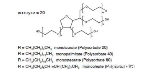 以PEG結構為基礎的表面活性劑除了上述幾種,還有一些特別的種類。維生素E聚乙二醇琥珀酸酯,通過琥珀酸將PEG1000連接到維生素E上,HLB為13。Solutol HS 15中的表面活性劑結構是,聚乙二醇15-羥基硬脂酸,但是實際上上市售的Solutol HS 15中出了這種表面活性劑,還包括PEG,是一種有機共溶劑和表面活性劑的混合物。聚乙二醇也可以和甘油結構直接相連,形成各種PEG化的甘油酯。