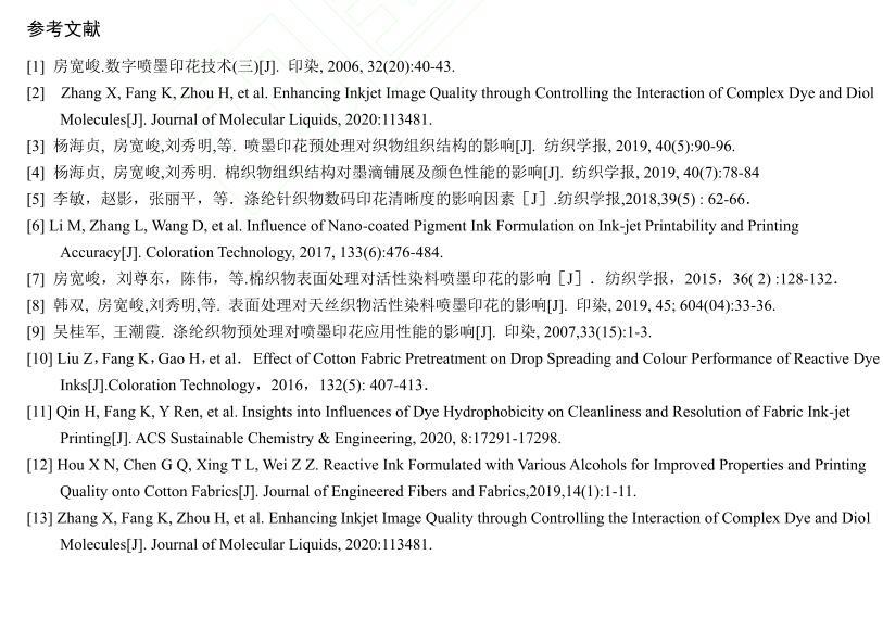 【摘要】:為了研究活性染料墨水黏度和表面張力對棉織物印花性能的影響,配制不同黏度和表面張力的活性紅墨水,測試打印后織物的滲透率、K/S值、墨量及打印線寬等指標。結果表明:提高墨水黏度會降低墨滴在織物上的潤濕和滲透性能,打印到織物的墨量減少,打印清晰度下降。不同黏度的墨水對打印線條經緯向的清晰度影響機制不同,表面張力對織物打印性能的影響比黏度小。