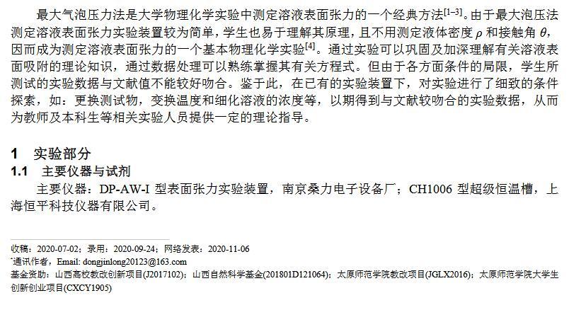 最大泡壓法測(cè)定溶液表面張力實(shí)驗(yàn)條件的優(yōu)化