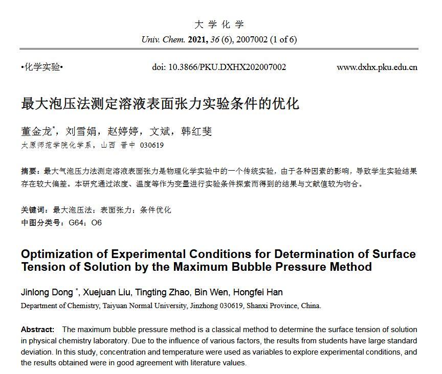 【摘要】:最大氣泡壓力法測(cè)定溶液表面張力是物理化學(xué)實(shí)驗(yàn)中的一個(gè)傳統(tǒng)實(shí)驗(yàn),由于各種因素的影響,導(dǎo)致學(xué)生實(shí)驗(yàn)結(jié)果存在較大偏差。本研究通過(guò)濃度、溫度等作為變量進(jìn)行實(shí)驗(yàn)條件探索而得到的結(jié)果與文獻(xiàn)值較為吻合。