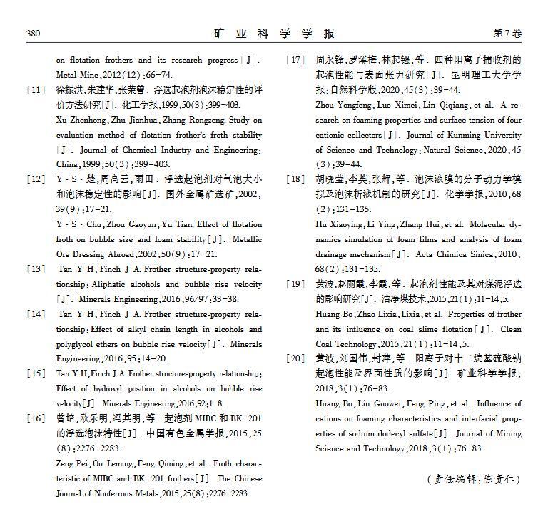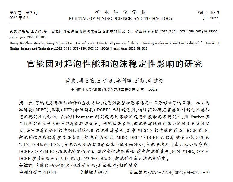 【摘要】:浮選是分離微細物料的重要方法,起泡劑類型和泡沫穩定性顯著影響浮選效果。本文選取醇類(MIBC)、酯類(DEP)和醚醇類(DGBE)三種起泡劑,通過實驗研究官能團對起泡性能和泡沫穩定性的影響。實驗用Foamscan測定起泡劑溶液的起泡性能和泡沫穩定性,用Tracker流變儀測定表面張力和氣液界面黏彈模量。研究結果表明:起泡速率隨表面張力的減小呈線性增大,當氣液界面吸附起泡劑達到飽和時起泡速率最大,其中MIBC的起泡速率最高,DGBE最小;起泡劑濃度為臨界質量分數時,起泡能力最大,MIBC、DEP和DGBE的臨界質量分數分別為1.1%、0.4%和0.8%;氣泡的大小隨溶液表面張力減小而減小,氣泡平均尺寸由大至小順序為:DGBEDEPMIBC;在泡沫穩定性方面,醚醇類起泡劑最強,醇類起泡劑最差,同時MIBC、DEP和DGBE質量分數分別為0.4%、0.5%和0.8%時,起泡劑生成的泡沫最穩定。