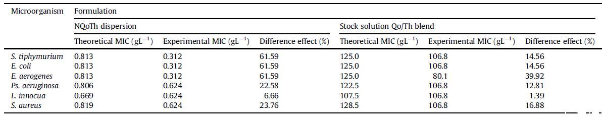 本研究的一個(gè)目標(biāo)是確定對(duì)微生物的影響是否是由于組分的協(xié)同或相加作用。通過根據(jù)NQoThs中存在的百分比(QoLMW為75%,Th為25%)對(duì)QoLMW和Th的MIC進(jìn)行加權(quán),將NQoThs的MIC與附加效應(yīng)的估計(jì)值進(jìn)行比較。NPs(NQoTh)和QoLMW/Th原液的MIC值均低于基于組分加和效應(yīng)估計(jì)的MIC,表明Qo和Th之間存在協(xié)同效應(yīng)(見表5)。然而,取決于測(cè)試的細(xì)菌,NPs的MIC比庫(kù)存QoLMW/Th混合物低大約1.5到4.5倍。Wazed Ali、Rajendran和Joshi(2011)評(píng)估了使用TPP從440-kDa Qo的1.0%(w/v)溶液中產(chǎn)生的NQo(115.5 nm)的AM抗金黃色葡萄球菌。NQo比Qo原液更有效地抑制這些細(xì)菌的生長(zhǎng)50%。
