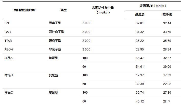 對于溶液而言,表面活性劑的存在能顯著降低表面張力,本文研究了不同表面活性劑溶液,同一含量下,兩種方法測試結果的差異以及同一表面活性劑溶液,不同含量下兩種方法測試結果的差異。所有方法按規(guī)范操作執(zhí)行,測試溫度25℃,平行測定5次取算數(shù)平均值,比較結果如表2所示。