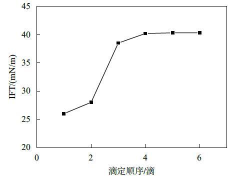 結果表明,液滴懸置5 min后,第一滴液滴表面張力值最小,隨著連續(xù)滴定的進行,液滴表面張力值逐漸增大,最終趨于平衡。究其原因,可能是由于懸置一段時間后,表面活性劑分子在表面充分吸附,所以第一滴液滴表面張力最小,而隨著連續(xù)滴定進行,由于平衡時間較短,表面活性劑分子在液滴的表面吸附未達平衡,所以數(shù)值逐漸增大,然而滴加液滴的速度一定,表面活性劑分子在表面的遷移速率一定,降低表面的能力與效率一定,最終會達到一個穩(wěn)定值。而平衡時間的長短,與表面活性劑分子的性質有關,遷移吸附速率快的表面活性劑分子所需時間較短。由此可見,使用懸滴法測定表面張力時,時間效應的影響不可忽略。