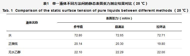 表1單一液體不同方法間的靜態(tài)表面張力測定結果對比(25℃)