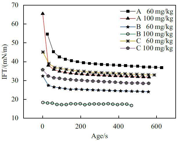 為了充分證明時間效應對懸滴法測定結果會造成影響,實驗使用懸滴法對A,B,C三種表面活性劑復配溶液較稀含量下的動態(tài)表面張力進行了研究。結果如圖3所示。