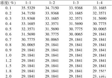 1)5.0%黃花敗醬皂甙溶液的配制:稱取黃花敗醬皂甙5.0g置于100mL容量瓶中,加蒸餾水至刻度混合均勻,以待備用。取不同量5.0%黃花敗醬皂甙溶液配制其他濃度溶液。