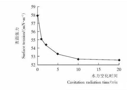 空化時間對原糖溶液表面張力的影響配置濃度為0.15g/mL的原糖溶液3.5L,水浴加熱溶液到60℃,在0.2 MPa壓力下通過空化裝置循環(huán)不同的時間(1,2,5,10,20min),測定空化前后原糖溶液的表面張力的變化。