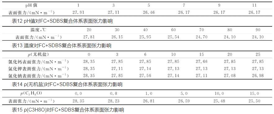 依據實驗Hz實驗結果,按照SDBS的0.395 6 g/L與0.056 0 g/L的FC復配,分別測試pH值、溫度、無機鹽和溶劑對復配體系表面張力的影響,結果見表12~15。