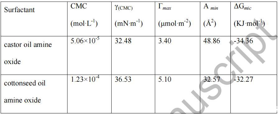 由表2可知,蓖麻油酰胺氧化胺和棉籽油酰胺 氧化胺將水的表面張力降低到最小值約 在 5.06×10-5 mol/L 的濃度下為 32.48 mN/m,在 5.06×10-5 mol/L 的濃度下為 36.53 1.23×10-4 mol/L,表明它們的表面活性很高。 和....相比 一些已報(bào)道的氧化胺表面活性劑,[12] 如十六烷基二甲基 氧化胺、十八烷基二甲基氧化胺和椰油酰胺丙基二甲基胺 氧化物等,其CMC值通常在10-4范圍內(nèi) ~10-3 mol/L, 這些 CMC 值較低。 這可能是因?yàn)閹追N酰胺的混合物 氧化胺具有協(xié)同增強(qiáng)的作用,提高了表面 活動(dòng)總體上。 還可以發(fā)現(xiàn),蓖麻油的 CMC 和 γ(CMC) 值 酰胺氧化胺遠(yuǎn)低于棉籽油酰胺氧化胺,后者 可能是由于蓖麻油酰胺氧化胺中存在-OH。 [13] 在 另外,從表 2 中的數(shù)據(jù)可以看出,蓖麻油的Γmax 值 酰胺氧化胺低于棉籽油酰胺氧化胺,而 前者的Amin值大于后者。 這一結(jié)果可能歸因于 烷基鏈的長度。 此外,ΔGmic 的負(fù)值表明 9 在 25 oC 時(shí),膠束化是自發(fā)的,這意味著這兩種天然植物油 酰胺胺氧化物在空氣-水界面有極好的吸收能力 在溶液中形成膠束。