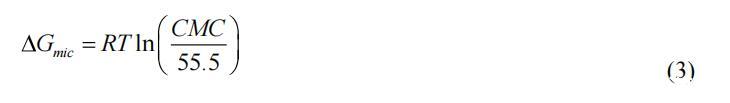 其中 R 是氣體常數(shù),NA 是阿伏伽德羅數(shù),T 是絕對溫度,并且 n 是溶質(zhì)種類的數(shù)量,我們可以將其設(shè)置為 1。 膠束化的自由能 (ΔGmic) 由等式 (3) 計(jì)算。