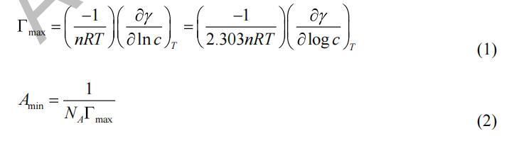 通過分析平臺(tái)獲得最小表面張力(γCMC)值 地塊的區(qū)域。 確定臨界膠束濃度 (CMC) 值 從表面張力的斷點(diǎn)與濃度的對數(shù) 曲線。 最大表面過量濃度(Γmax)和最小表面積 (Amin) 在空氣/水界面被每個(gè)表面活性劑分子占據(jù)的計(jì)算公式為 吉布斯吸附方程: