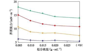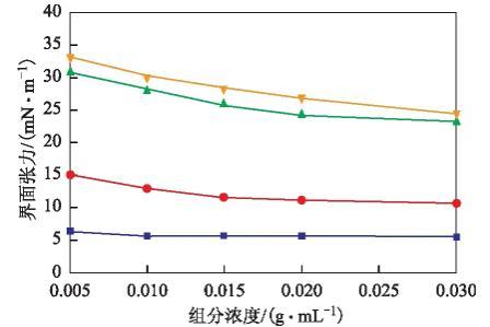 圖1 380號(hào)燃料油中四組分的油水界面張力曲線飽和分;▲—芳香分;●—膠質(zhì);■—瀝青質(zhì)
