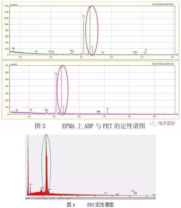 結(jié)果顯示無論是EPMA-1720上的ADP晶體還是PET晶體,其分辨率都毫無疑問地能把S Ka(特征波長0.5373nm)和Pb Ma(特征波長0.5285nm)明顯的區(qū)分開來,呈現(xiàn)的是分開的兩個峰,見圖3中的紅色線內(nèi)。而相同測試條件下的EDS譜圖中S Ka峰(特征能量2.308keV)已然不能使用軟件自動識別標(biāo)出,手動添加的結(jié)果見圖4,其與Pb的Ma峰(特征能量2.343keV)重疊在一起,不能分開。