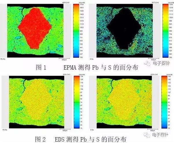 圖2為EDS測試結(jié)果,顯示Pb與S元素分布區(qū)域基本一致的現(xiàn)象,此為假象。這是由于兩個元素的主峰相互重疊,在能量上已不能被儀器區(qū)分開的緣故。