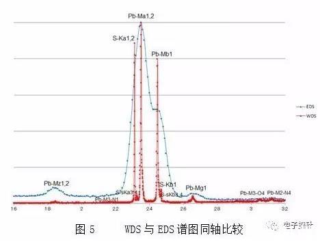 我們把此兩個譜圖放到一個坐標(biāo)軸上就能更好的對比,組合中圖5的橫軸為能量(單位keV),WDS的分辨率比EDS高出一個數(shù)量級。