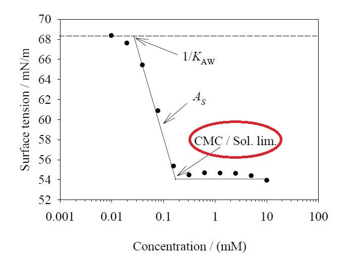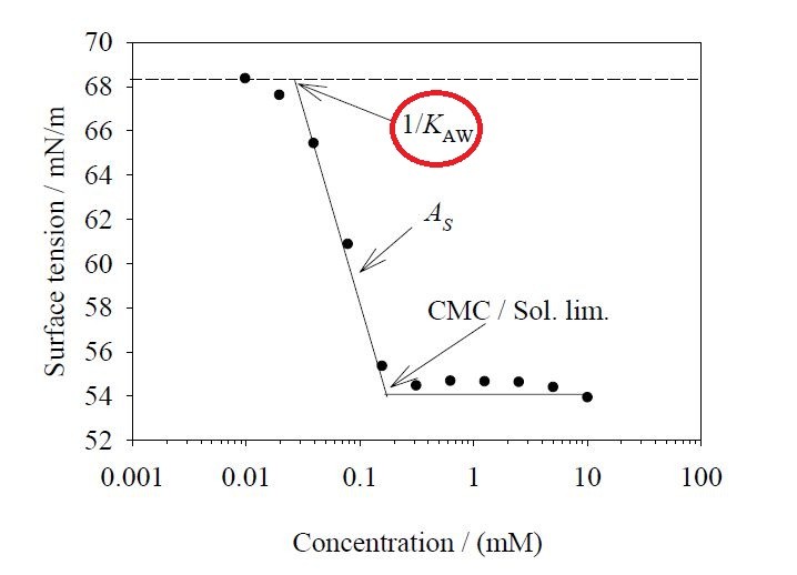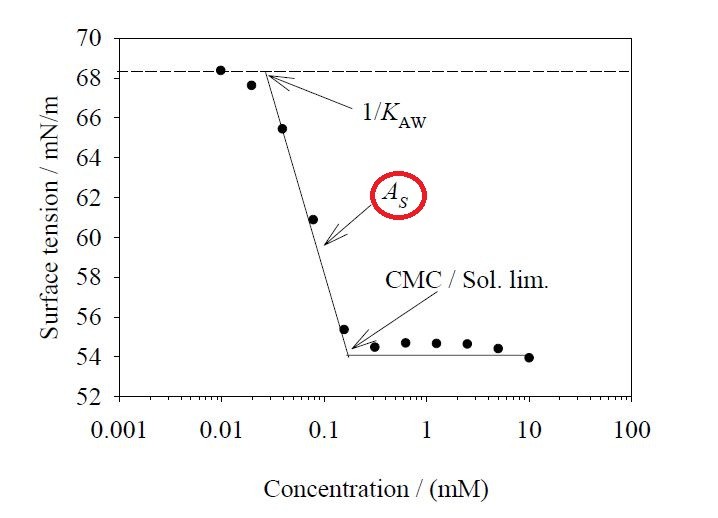 化合物分子定向和折疊決定了極性和非極性基團(tuán)之間的對(duì)抗和平衡,通過(guò)真正表面積TSA(=每個(gè)吸附分子的平均面積)來(lái)反映。表面積來(lái)源于吸附等溫線,即在表面飽和的表面過(guò)剩濃度(最大吸附值)。